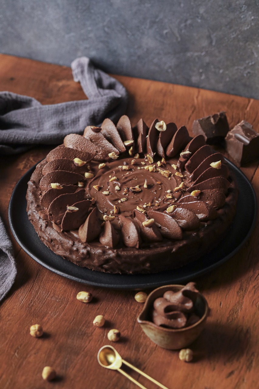 Ingredientes: Base: aveia sem glúten, óleo de coco, avelã, amido de milho, hidropropil metil celulose, fibra de tapioca, stévia reb a, mel de tâmaras, manteiga vegana (Óleo de coco, óleode girasol, castanha de caju, lecitina de girassol, urucum e sal). Mousse de gianduia: leite de coco, avelã, biomassa de banana verde, chocolate 42% cacau vegano adoçado com tâmaras, pasta de tâmaras, creme de avelã e chocolate adoçado com tâmaras, água, cacau em pó, stévia, fribra de milho. Ganache gianduia: creme de avelã e chocolate adoçado com tâmara, leite de coco, manteiga vegana.