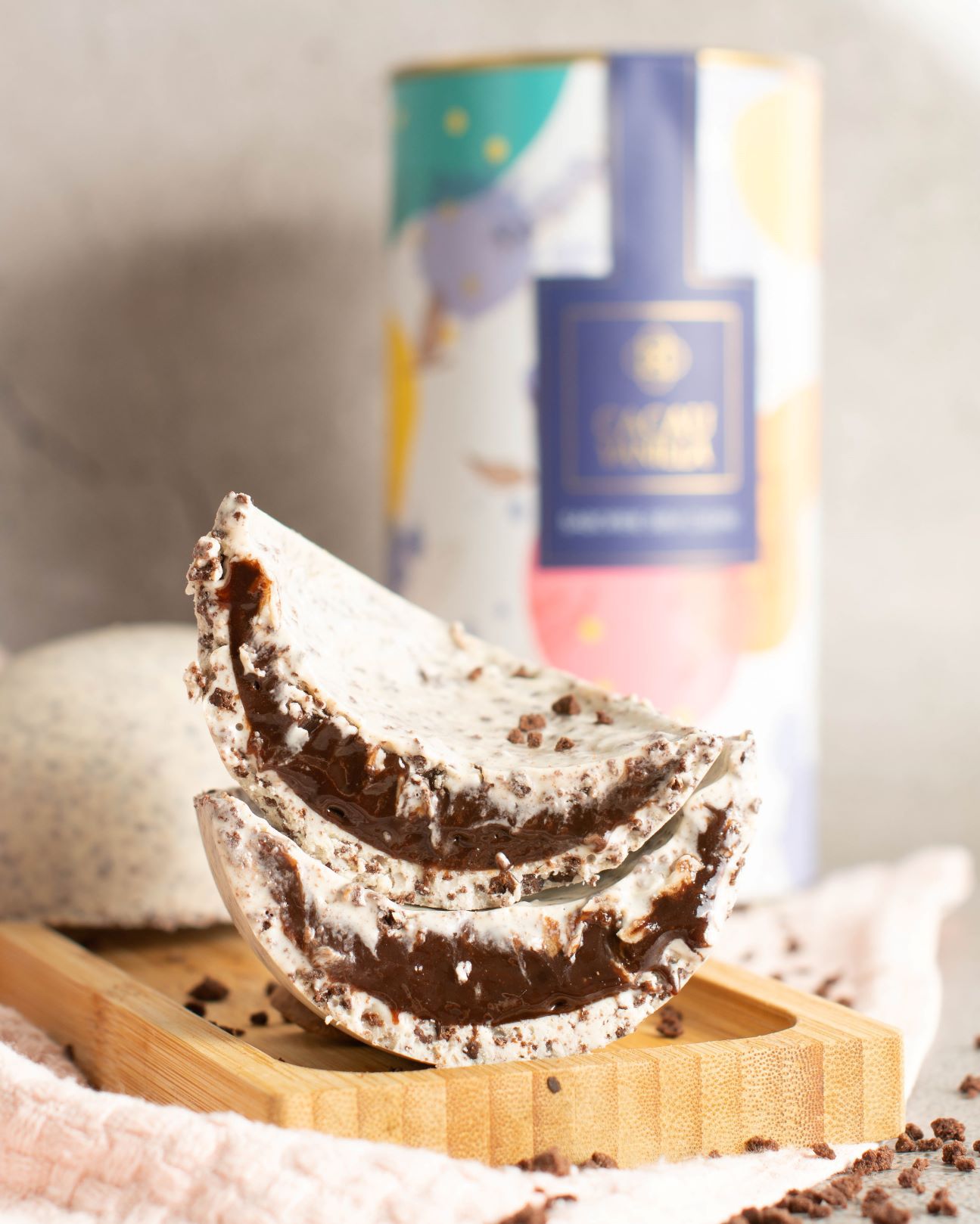 Chocolate branco, cookies de chocolate sem gluten e zero açúcar.